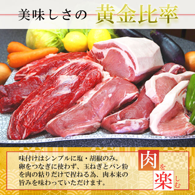 材料は「近江牛、国産豚、玉ねぎ、パン粉、塩胡椒」のみ。これ以外は何も使っていません。お肉本来の味を味わっていただきたいから、余分なものは一切入れていません。