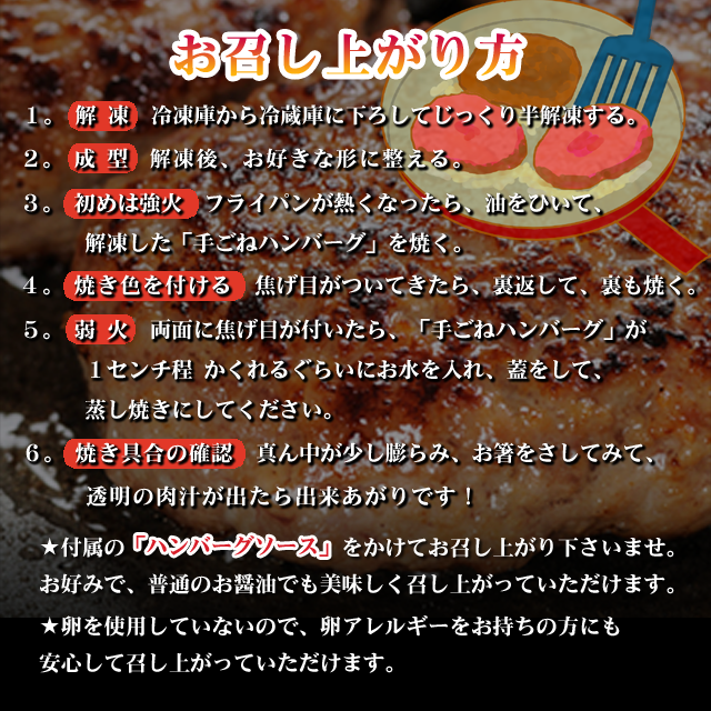 つなぎに卵を使っていないので、卵アレルギーの方にも安心して召し上がっていただけます。
