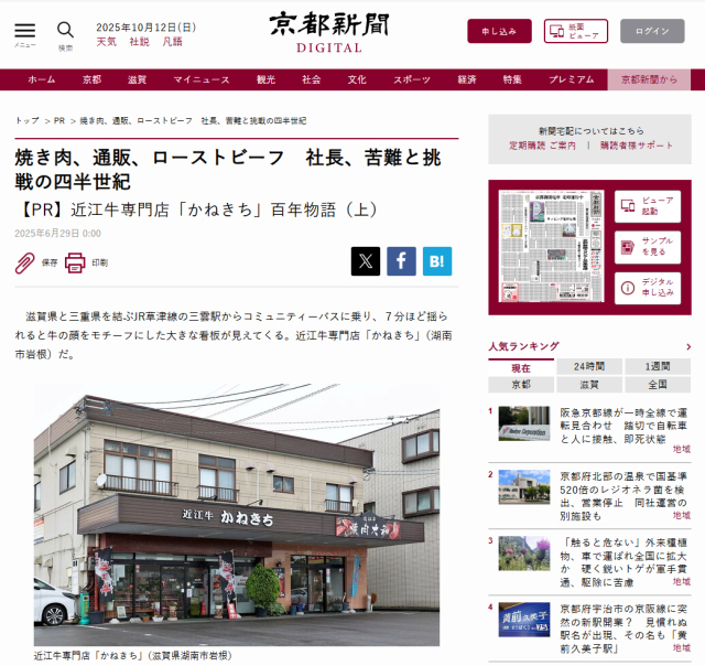 京都新聞デジタル版「KYO-POINT」に『近江牛特選和風とろ生ローストビーフ』を掲載いただきました。